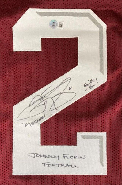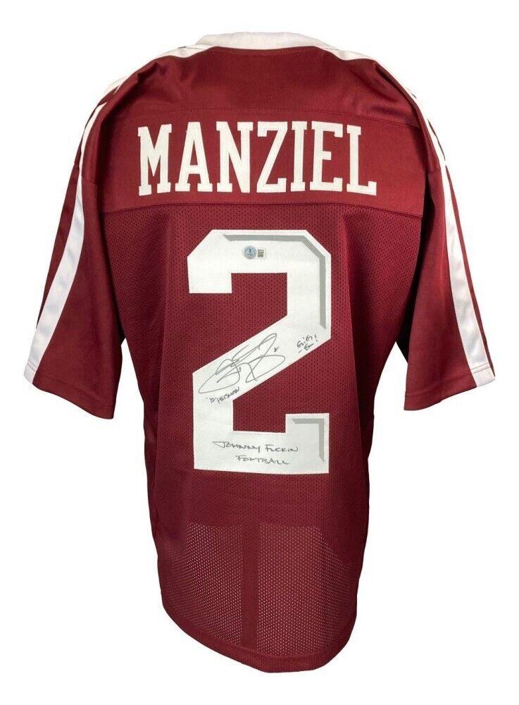 Custom on-field style jersey with everything sewn on, size XL. Hand-signed and 3 times inscribed by Johnny Manziel.The autograph includes an official Beckett Authentication Services serially numbered hologram and QR Code card for authenticity purposes. The signing of this item was witnessed by Beckett.Authentication: Beckett QR Code card