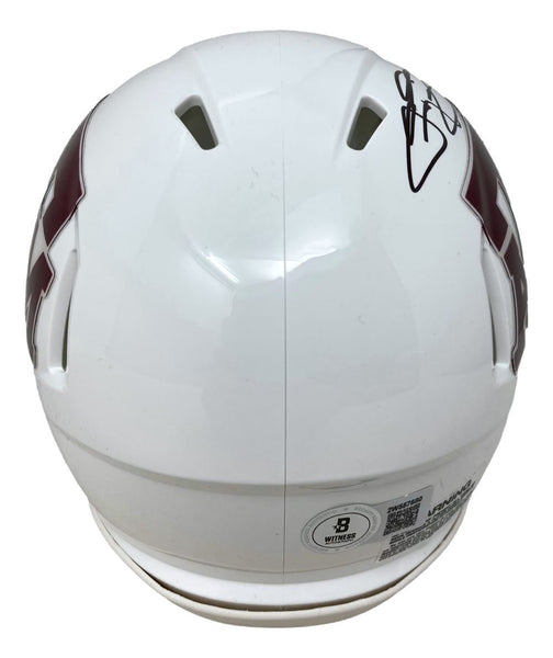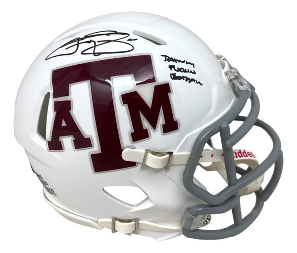 Featured is a Johnny Manziel signed Texas A&M mini speed helmet, inscribed "Johnny F..n Football". This helmet has been hand signed by Manziel and comes with the Beckett hologram and certificate of authenticity. This helmet would make a great addition to any sports memorabilia collection!. SPECIFICATIONS Autographed By: Johnny Manziel Team: Texas A&M Sport: Football Authentication: Beckett Grading Services