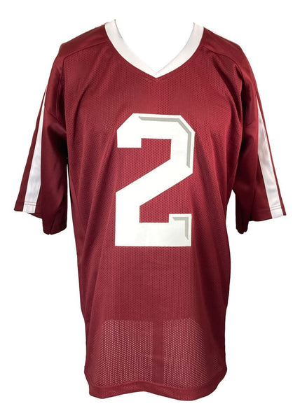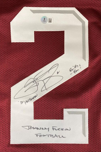 Featured is a Johnny Manziel signed custom football jersey, inscribed "Johnny F...G Football", "12 Heisman", and "Gig Em". This jersey has been hand signed by Manziel and comes with the Beckett witnessed hologram and certificate of authenticity. This jersey features professionally sewn letters and numbers and is size XL. This jersey has no team tags or emblems and is intended as a sports collectible. This jersey would make a great addition to any sports memorabilia collection! SPECIFICATIONS Autographed By: Johnny Manziel Team: Texas A&M Sport: Football Authentication: Beckett Grading Services