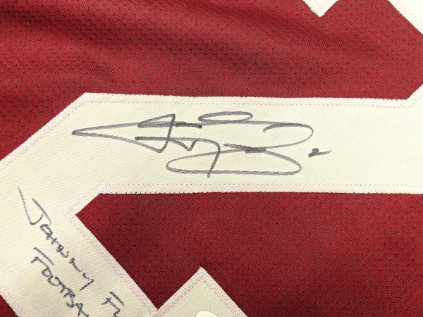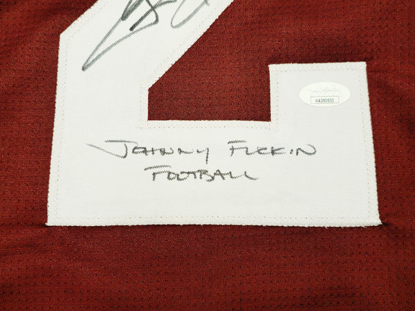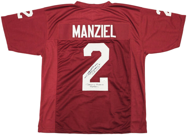 This is a Maroon Football Jersey that has been hand signed by Johnny Manziel. This is a custom jersey with no name brand. The approximate size is XL. It has nice sewn in name and numbers. This item was inscribed "Johnny F'ing Football." This item has been certified authentic by JSA and comes with their tamper-proof sticker and matching certificate of authenticity.