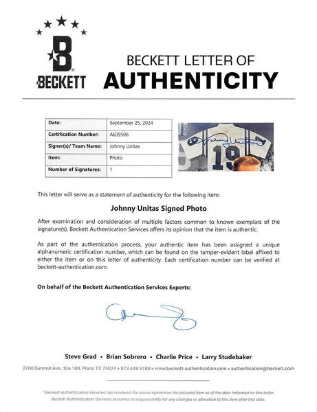 This Autographed 8x10 Photo has been Personally Signed by Johnny Unitas of the Indianapolis Colts. This item is 100% Authentic to include a hologram by Beckett Authentication Services. This item will come with an affixed Beckett Authentication Services (BAS) authentication sticker, which includes a scannable QR code to verify authenticity. Please note that Beckett no longer provides serial-numbered COA cards, and the attached BAS sticker will serve as the complete authentication for this item. The authenticity can be verified on Beckett Authentication Services website.