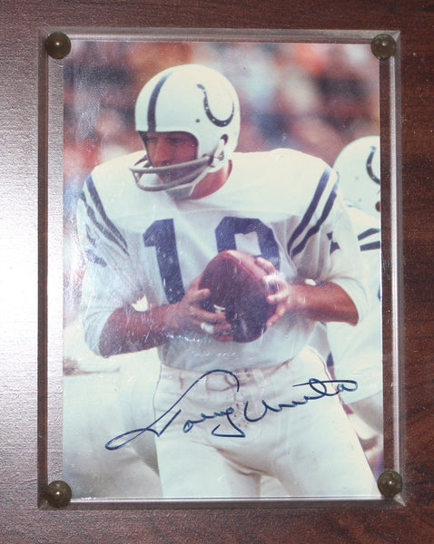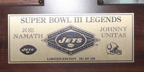 Johnny Unitas & Joe Namath Autographed Legends Wood Plaque BAS 32230 The number in the listing title is just an inventory sku for our records and is not the authentication number. This is a framed plaque of two different 5"x3.5" photos that were personally autographed by both Johnny Unitas and Joe Namath. This is the exact item that you will receive so please see pictures for condition. Includes a certificate of authenticity from James Spence Authentication (JSA) and Denver Autographs.