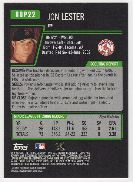 Jon Lester Signed Red Sox 2006 Bowman Draft Rookie Baseball Card #BDP22 (SS COA)