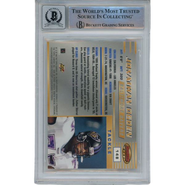 The number in the listing title is just an inventory sku for our records and is not the authentication number. The item pictured is a stock photo unless otherwise noted. This is a Baltimore Ravens 1996 Bowman's Best #148 Slabbed Trading Card with a Grade 10 Autograph that was personally autographed by Jonathan Ogden. Includes a certificate of authenticity from Beckett Grading Services (BAS) and Denver Autographs.FREE SHIPPING within the USA on orders over $10!