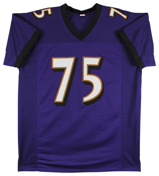 This Autographed Purple Pro Style Jersey with the inscription of "HOF 13" has been Personally Signed by Jonathan Ogden of the Baltimore Ravens. This item is 100% Authentic to include a Certificate of Authenticity (COA) / hologram by Beckett Authentication Services. This is a BAS Witnessed Protection Program item which means a Beckett Authentication Service representative was present when this item was being signed. We conducted an autograph signing with Jonathan Ogden where multiples of the same item were signed. While the photographs are representative of this item, the size, placement and strength of the signature may vary. Each item is hand signed, therefore, each autograph is unique. This item can be verified through BAS Witnessed. This is a X-Large sized, non-branded, custom-stitched Jersey.
