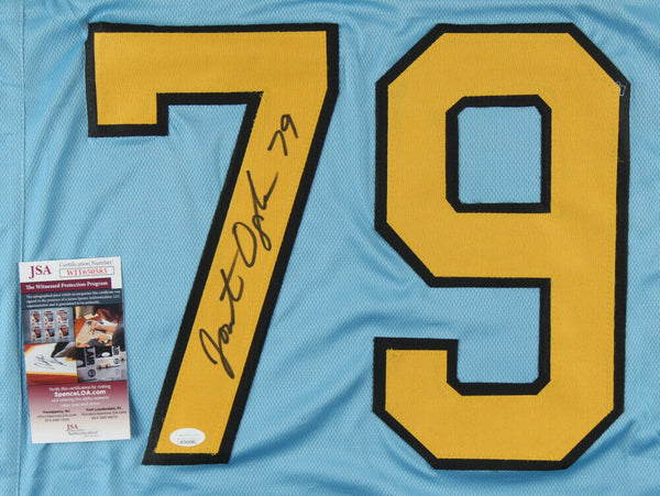 Custom on-field style jersey. Everything is sewn on, size XL. Has been hand-signed and inscribed by Jonathan Ogden (HOF). Please note, stains appear on the reverse jersey number.The lot / autograph(s) includes an official James Spence Authentication (JSA) hologram and matching COA for authenticity purposes. The signing of this item was witnessed by JSA.Authentication: JSA COA