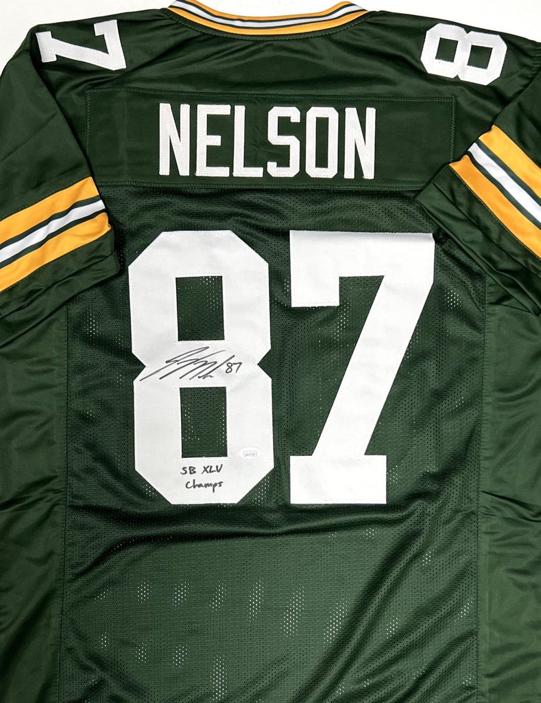 Custom Replica Jersey hand signed by Green Bay Packers Super Bowl XLV Champ JORDY NELSON. The signature is in Black Paint pen with the inscription "SB XLV Champs". This jersey was signed at a private signing with us and would make a great addition to any Packers collection! The jersey size is XL and all letters and numbers are sewn in. This autograph is guaranteed to be 100% authentic and will include a COA hologram from Beckett Authentication.