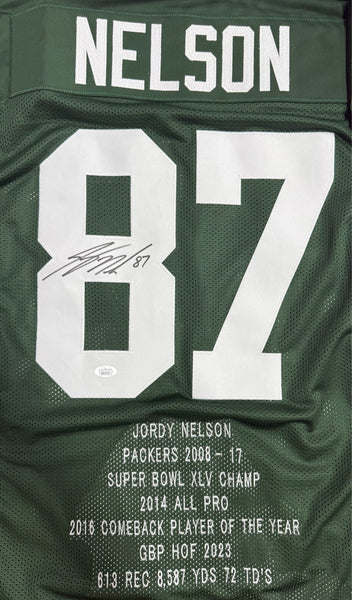 Custom Replica Jersey hand signed by Green Bay Packers Super Bowl XLV Champ JORDY NELSON. The signature is in Black Paint pen. This jersey was signed at a private signing with us and would make a great addition to any Packers collection! The jersey size is XL and all letters and numbers are sewn in. This autograph is guaranteed to be 100% authentic and will include a COA hologram from JSA Authentication.