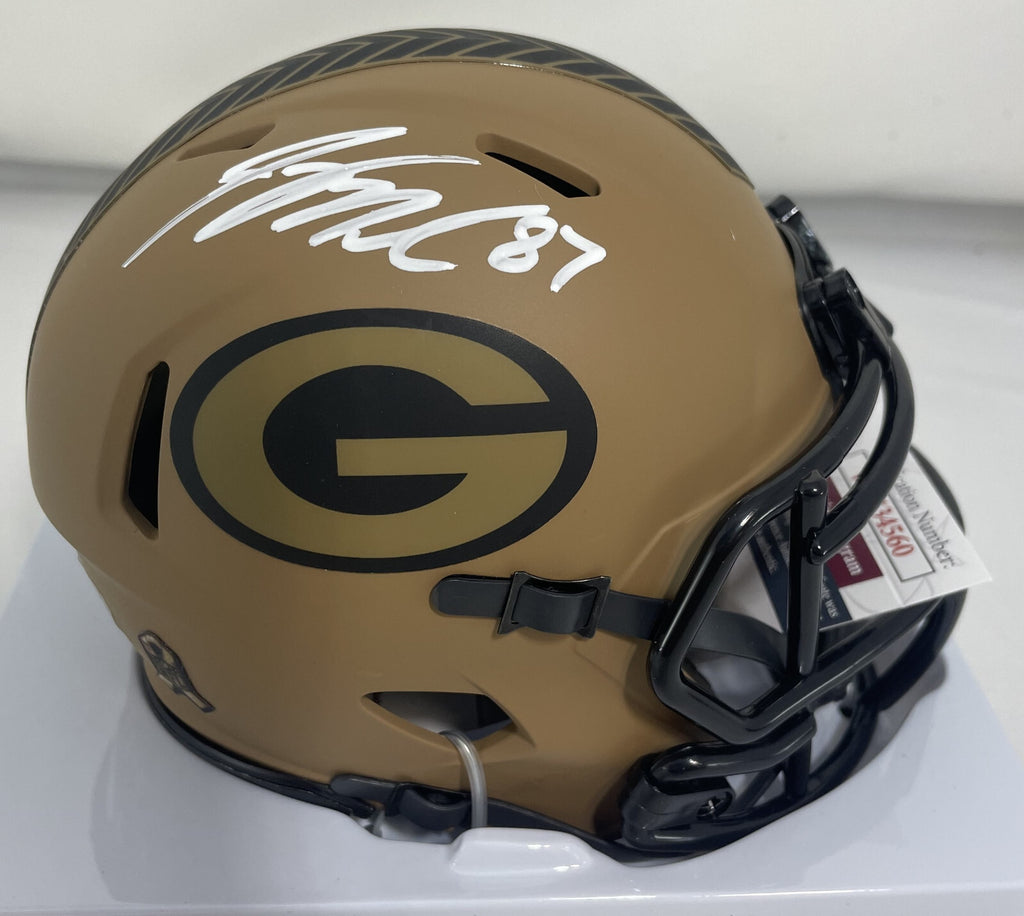 Riddell 2023 SALUTE TO SERVICE Speed Mini Helmet hand signed by former Green Bay Packers Super Bowl Champion Receiver JORDY NELSON. The signature is in White paint pen. This item was signed at a private signing and would make a great addition to any Packers collection! This item is guaranteed to be 100% authentic and will include a COA from JSA authentication.