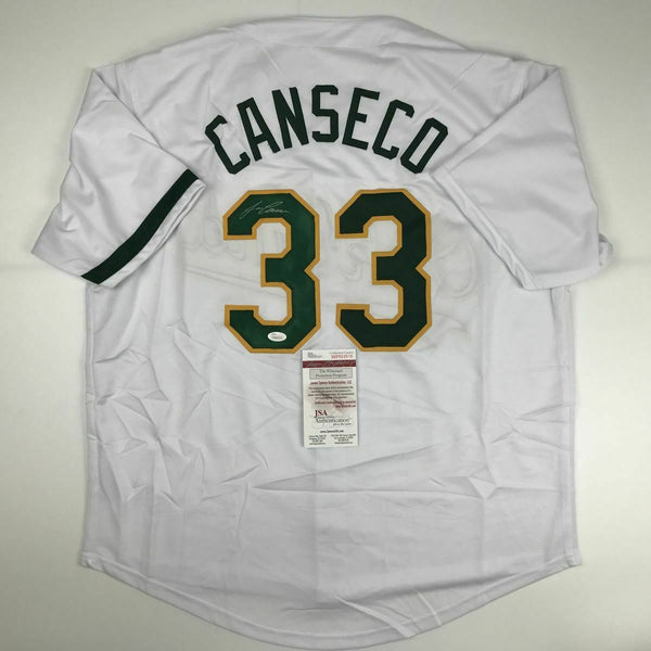 Autographed/Signed JOSE CANSECO Oakland White Baseball Jersey JSA COA Auto This is a custom jersey and was not manufactured by or in any manner associated with any professional sports league or manufacturer. This custom jersey carries no professional sports league designation. The item is intended to be an autographed collectible. Reference of team in the title is to allow the purchaser a point of association. The custom jersey displays the name, number and authenticated signature of the player. This item in no way is affiliated with or connected to any professional sports organization. The autograph, as always is guaranteed to be authentic and has been certified as authentic by a third-party, trusted authenticator. Size is XL unless otherwise noted.