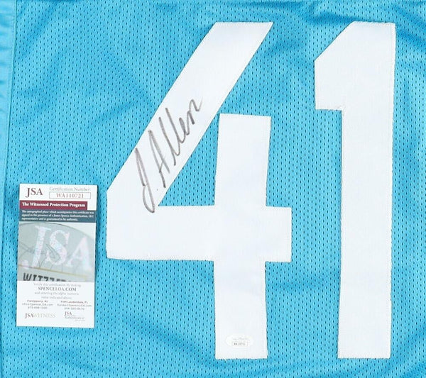 This autographed jersey has been personally hand-signed by Josh Allen of the Jacksonville Jaguars.This autograph is certified by James Spence Authentication's (JSA) Witnessed Protection Program. That means that a JSA representative was present when this item was signed. It comes with the numbered hologram and matching Certificate of Authenticity.Custom on-field style jerseys are a more affordable option for autograph seekers. These jerseys do not have any brand name or tags and are made in the Philippines. They feature stitched on names and numbers and are made to look very similar to the on-field jerseys that the players wear. These custom jerseys are very commonly used in the memorabilia industry.