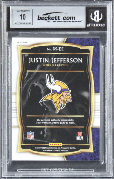 This Autographed Auto Graded Gem Mint 10! 2020 Select Draft Selections Memorabilia Prizm Red #9 Card has been Personally Signed by Justin Jefferson of the Minnesota Vikings. This item is 100% Authentic, it comes slabbed and authenticated by Beckett Authentication Services. The authenticity can be verified on Beckett Authentication Services website.