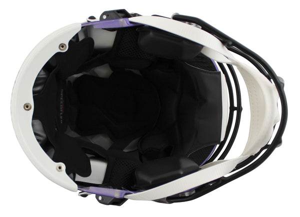 This Autographed Authentic Riddell Speed Flex Full Size Helmet has been Personally Signed by Justin Jefferson of the Minnesota Vikings. This item is 100% Authentic to include a hologram by Beckett Authentication Services. This item will come with an affixed Beckett Authentication Services (BAS) authentication sticker, which includes a scannable QR code to verify authenticity. Please note that Beckett no longer provides serial-numbered COA cards, and the attached BAS sticker will serve as the complete authentication for this item. This is a BAS Witnessed Protection Program item which means a Beckett Authentication Service representative was present when this item was being signed. We conducted an autograph signing with Justin Jefferson where multiples of the same item were signed. While the photographs are representative of this item, the size, placement and strength of the signature may vary. Each item is hand signed, therefore, each autograph is unique. This item can be verified through BAS Witnessed.