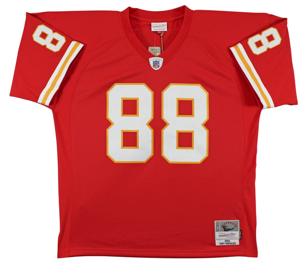 This Autographed Red Mitchell & Ness Jersey with the inscription of "HOF 19" has been Personally Signed by Tony Gonzalez of the Kansas City Chiefs. This item is 100% Authentic to include a hologram by Beckett Authentication Services. This item will come with an affixed Beckett Authentication Services (BAS) authentication sticker, which includes a scannable QR code to verify authenticity. Please note that Beckett no longer provides serial-numbered COA cards, and the attached BAS sticker will serve as the complete authentication for this item. This is a BAS Witnessed Protection Program item which means a Beckett Authentication Service representative was present when this item was being signed. We conducted an autograph signing with Tony Gonzalez where multiples of the same item were signed. While the photographs are representative of this item, the size, placement and strength of the signature may vary. Each item is hand signed, therefore, each autograph is unique. This item can be verified through BAS Witnessed. This is a X-Large sized Jersey.