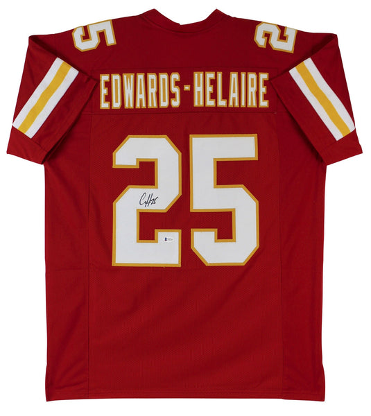 This Autographed Red Pro Style Jersey has been Personally Signed by Clyde Edwards-Helaire of the Kansas City Chiefs. This item is 100% Authentic to include a hologram by Beckett Authentication Services. This item will come with the new Beckett Authentication hologram that has a scannable QR code rather than the traditional COA. If you would like to have a COA, you are welcome to reach out to Beckett for a printed certification once you receive your item. This is a BAS Witnessed Protection Program item which means a Beckett Authentication Service representative was present when this item was being signed. This is a stock item. We conducted an autograph signing with Clyde Edwards-Helaire and we have several of these available. The one you will receive will be of equal quality to the one pictured. This item can be verified through BAS Witnessed. This is a X-Large sized, non-branded, custom-stitched Jersey.