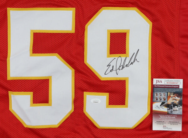 This autographed jersey has been personally hand-signed by Ed Podolak of the Kansas City Chiefs. This autograph is certified by James Spence Authentication's (JSA) Witnessed Protection Program. That means that a JSA representative was present when this item was signed. It comes with the numbered hologram and matching Certificate of Authenticity. Check out all the items in our Friendly Confines Collectibles store, Thanks for looking.