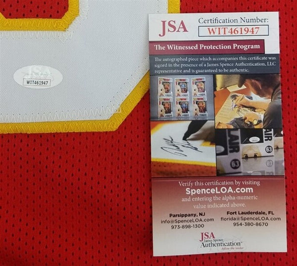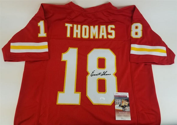 Custom on-field style jersey. Everything is sewn on, size XL. Hand-signed in black felt-tip pen by Emmitt Thomas. The lot / autograph(s) includes an official James Spence Authentication (JSA) hologram and matching COA for authenticity purposes. The signing of this item was witnessed by JSA.Authentication: JSA COA