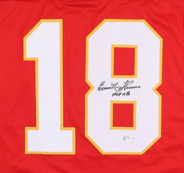 Custom on-field style jersey. Everything sewn on, size XL. Hand-signed and inscribed by Emmitt Thomas (HOF).The autograph includes an official PSA/DNA hologram and QR Code Card for authenticity purposes. The signing of this item was witnessed by PSA.Authentication: PSA Hologram & QR Code Card
