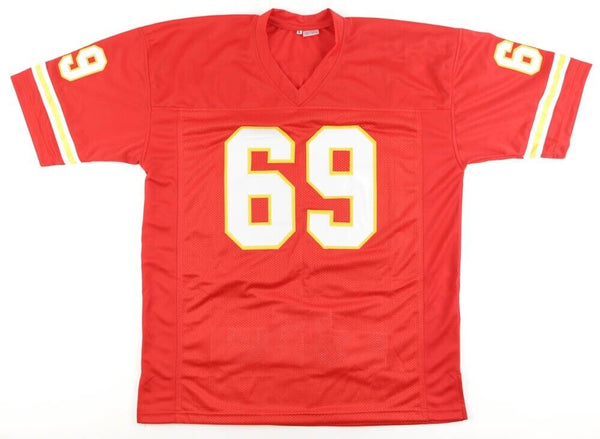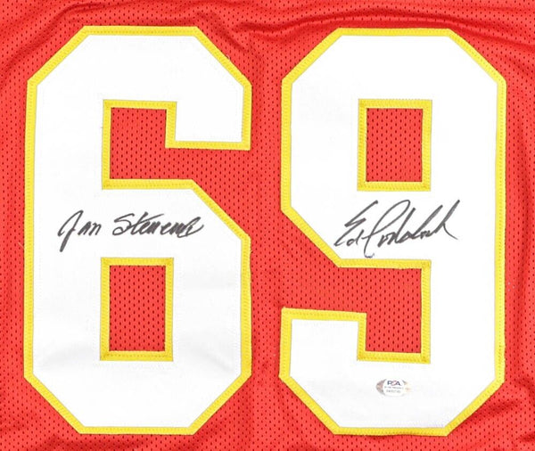 Custom on-field style Super Bowl IV jersey. Everything is sewn on, size XL. Has been hand-signed by Jan Stenerud and Ed Podolak. The game highlight has been stitched onto the back of the jersey below the numbers.The lot / autograph(s) includes an official PSA/DNA hologram and matching COA for authenticity purposes. The signing of this item was witnessed by PSA.Authentication: PSA COA