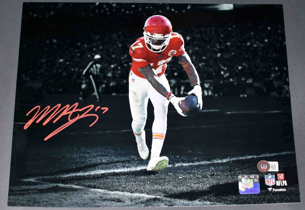 Mecole Hardman, Pro Bowl wide receiver for the Kansas City Chiefs, has hand signed this 11x14 photo at a private signing. He included the inscription "Jet" with his signature. This item is authenticated by Beckett Authentication Services and was signed in the presence of one of their representatives. Their tamper-evident hologram featuring a QR code and serial number is on the item. The authenticity can be verified online by entering the serial number or scanning the QR code.Item pictured may not be the exact item you will receive. It will be similar quality, and we guarantee your satisfaction.