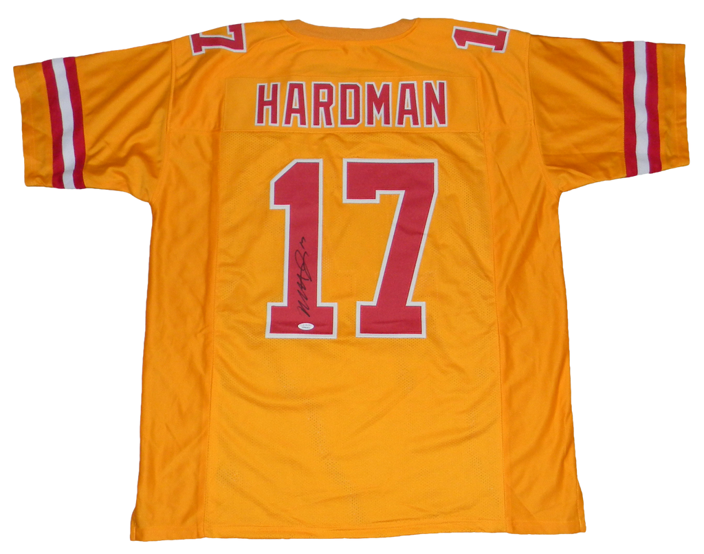 Mecole Hardman, Pro Bowl wide receiver for the Kansas City Chiefs, has hand signed this gold custom jersey at a private signing. Jersey is size XL and all letters/numbers are sewn-on. This item comes with a certificate of authenticity (COA) from JSA - James Spence Authentication and was signed in the presence of one of their representatives. You will receive a serial-numbered COA along with a matching serial-numbered sticker on the jersey. The authenticity can be verified online by entering the serial number. Item pictured may not be the exact item you will receive. It will be similar quality, and we guarantee your satisfaction.