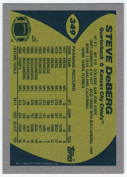 Steve Deberg signed Kansas City Chiefs 1989 Topps football trading card #349. Item comes with a Schwartz Sports Memorabilia tamper-proof numbered hologram (on back of physical card) and Certificate of Authenticity which can be verified online.