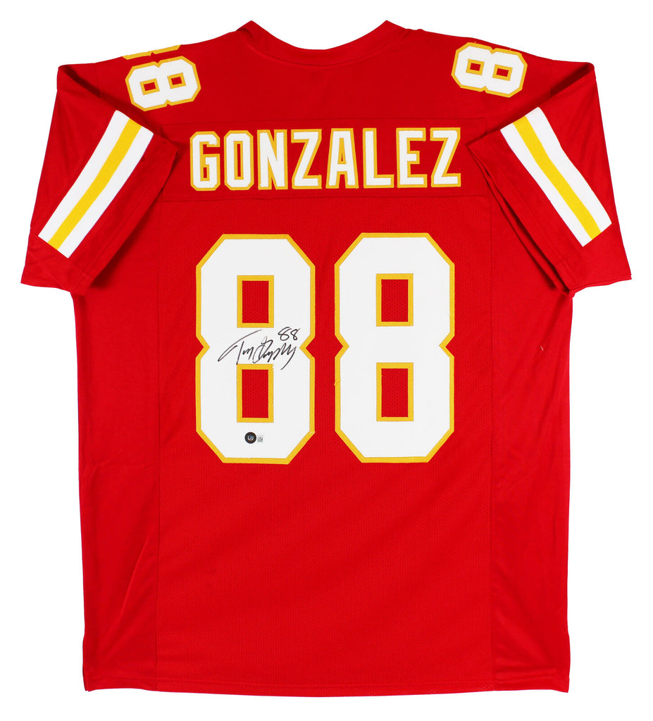 This Autographed Red Pro Style Jersey has been Personally Signed by Tony Gonzalez of the Kansas City Chiefs. This item is 100% Authentic to include a hologram by Beckett Authentication Services. This item will come with the new Beckett Authentication hologram that has a scannable QR code rather than the traditional COA. If you would like to have a COA, you are welcome to reach out to Beckett for a printed certification once you receive your item. This is a BAS Witnessed Protection Program item which means a Beckett Authentication Service representative was present when this item was being signed. This is a stock item. We conducted an autograph signing with Tony Gonzalez and we have several of these available. The one you will receive will be of equal quality to the one pictured. This item can be verified through BAS Witnessed. This is a X-Large sized, non-branded, custom-stitched Jersey.