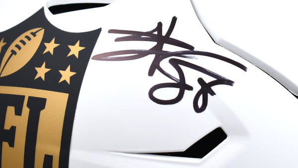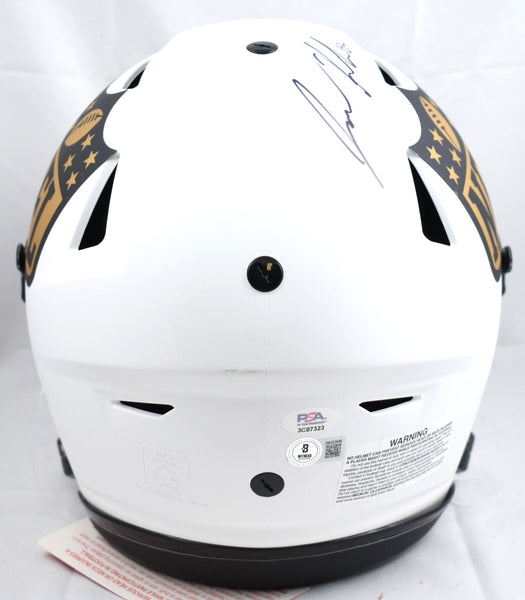 This is a Travis Kelce and Jason Kelce of the NFL Autographed Riddell football full size Lunar Speed Flex Authentic helmet. This item has a Beckett Witnessed Authentication and PSA Cert, which comes with a numbered sticker hologram and a QR code for Beckett verification. You can view this item on the Beckett and PSA Authentication website and it shows when and where the item was signed. It was signed either at a public autograph appearance or a private signing. This is a stock photo of the item. Although you may not receive this exact item, the item you receive is virtually identical, brand new, and in great shape. *Autograph location may vary* This is a Travis Kelce and Jason Kelce of the NFL Autographed Riddell football full size Lunar Speed Flex Authentic helmet. This item has a Beckett Witnessed Authentication and PSA Cert, which comes with a numbered sticker hologram and a QR code for Beckett verification. You can view this item on the Beckett and PSA Authentication website and it shows when and where the item was signed. It was signed either at a public autograph appearance or a private signing. This is a stock photo of the item. Although you may not receive this exact item, the item you receive is virtually identical, brand new, and in great shape. *Autograph location may vary*