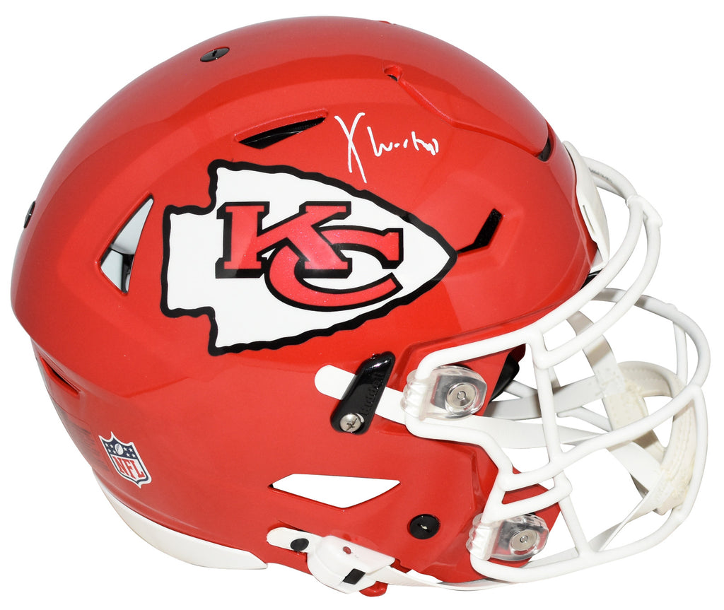 Xavier Worthy, star wide receiver for the Kansas City Chiefs, has hand signed this Chiefs Riddell SpeedFlex full-size authentic helmet at a private signing. This helmet is fully padded inside like the ones worn on the field. This item comes with a serial-numbered hologram from Fanatics Authentic, one of the leaders in the industry. The authenticity can be verified online by entering the serial-number. A Fanatics Authentic information card is also included.Item pictured may not be the exact item you will receive. It will be similar quality, and we guarantee your satisfaction.