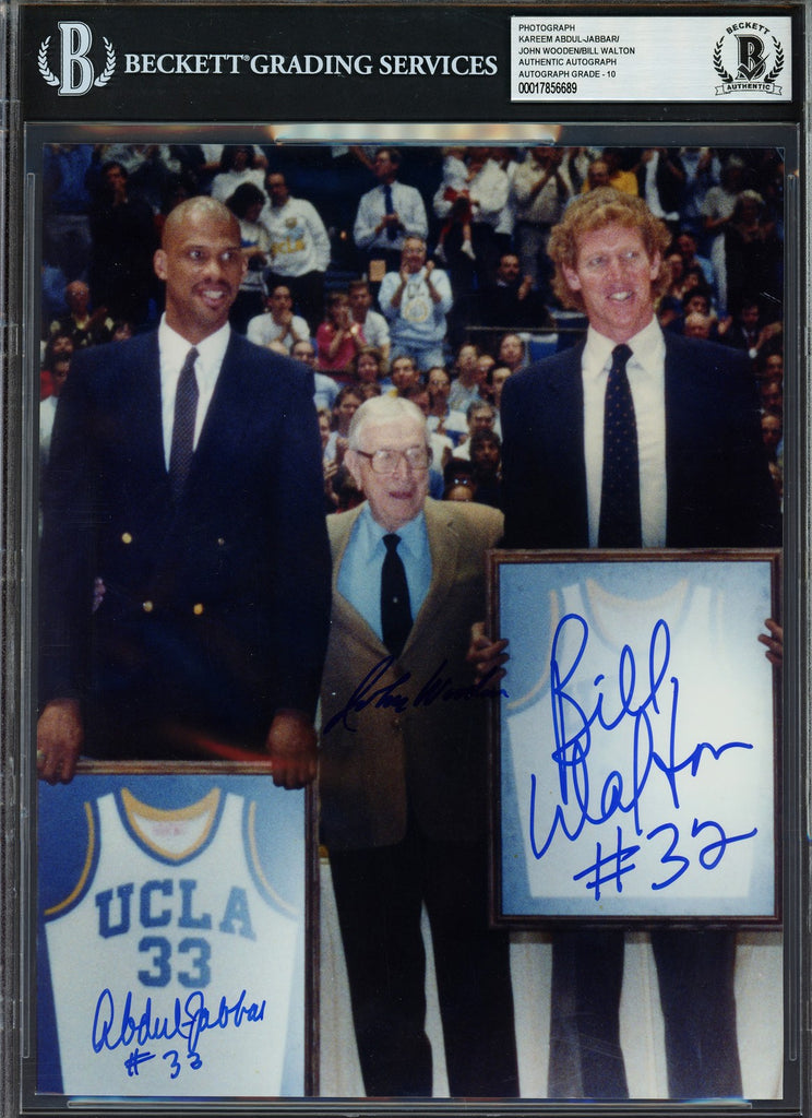 This is an 8x10 Photo that has been hand signed by Kareem Abdul Jabbar, John Wooden & Bill Walton. The condition of the signature was graded a Gem Mint 10 by Beckett BAS. It has been certified authentic by Beckett Authentication Services (BAS) and comes encapsulated in their tamper-proof holder.