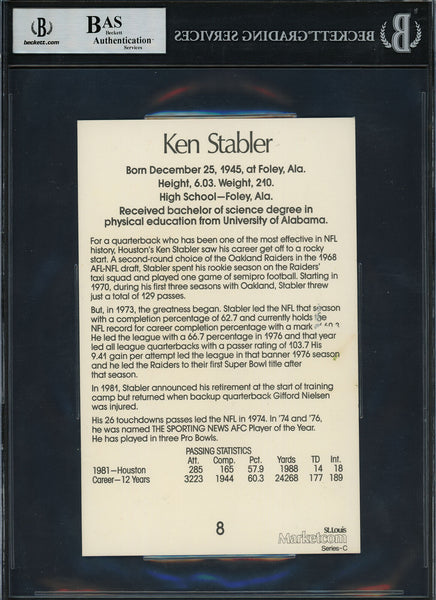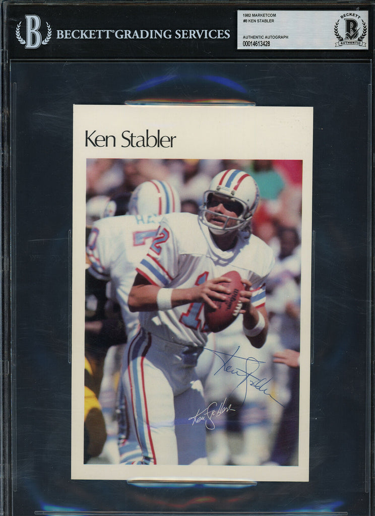 This is a 1982 Marketcom 5.5x8.5 Mini Poster #8 that has been hand signed by Ken Stabler. It has been certified authentic by Beckett Authentication Services (BAS) and comes encapsulated in their tamper-proof holder.