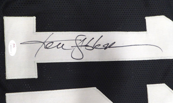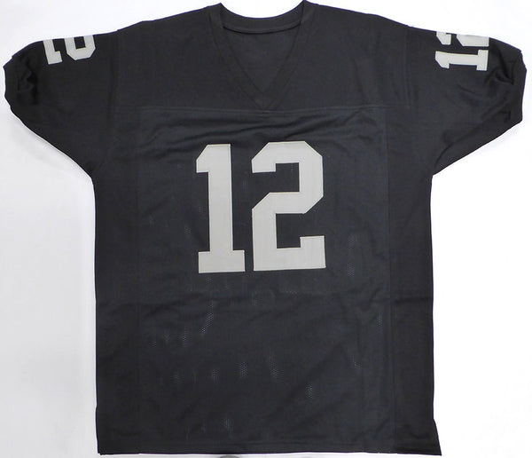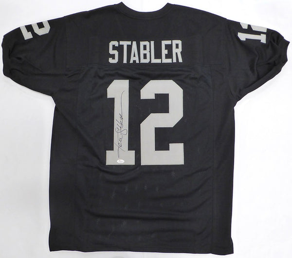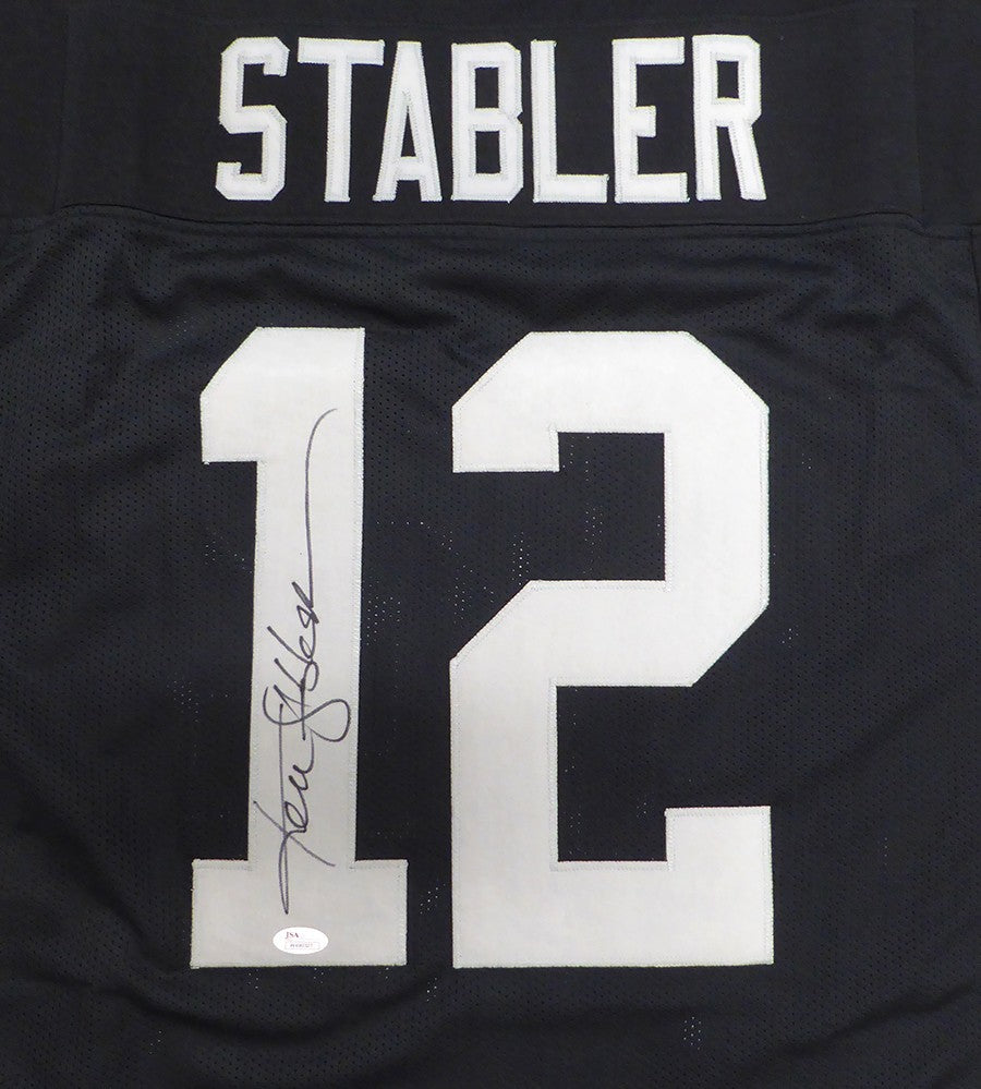 This is a Black Jersey that has been hand signed by Ken Stabler. This is a custom jersey with no name brand. The approximate size is XL. It has nice sewn in name and numbers. This item has been certified authentic by Beckett Authentication (BAS) and comes with their tamper-proof QR Code hologram.