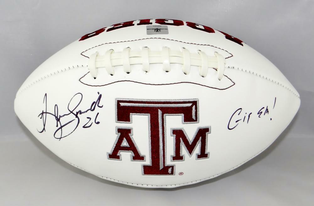 Kevin Smith Autographed Texas A&M Logo Football w/ Gig 'Em- Jersey Source Auth This is a Hand Autographed Logo Football of Kevin Smith of the Texas A&M Aggies and inscribed with "Gig 'Em". This item has been authenticated by The Jersey Source Authentication and each item has a unique Certification Number Hologram and matching Certificate of Authenticity. You can look up when and where the item was signed at thejerseysource.com. This is a stock photo of the item. Although you may not receive this exact item, the item you receive is virtually identical and brand new in great shape.