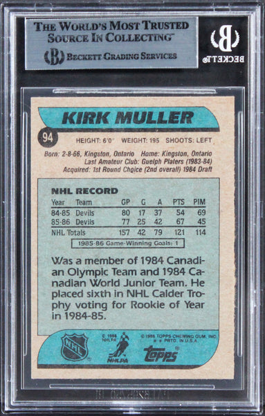 This Autographed 1986 Topps #94 Card has been Personally Signed by Kirk Muller of the New Jersey Devils. This item is 100% Authentic, it comes slabbed and authenticated by Beckett Authentication Services. The authenticity can be verified on Beckett Authentication Services website.