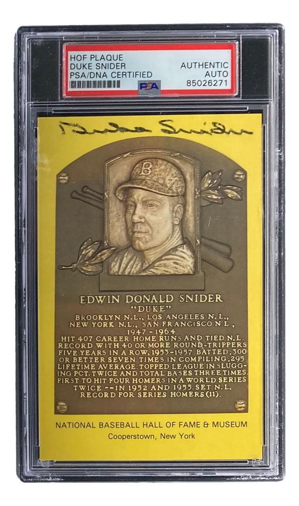 Featured is a Duke Snider (Brooklyn Dodgers) signed 4x6 Hall Of Fame plaque card. This card has been hand signed by Snider and has been authenticated and encapsulated by PSA/DNA. This card would make a great addition to any sports memorabilia collection!. SPECIFICATIONS Autographed By: Duke Snider Team: Brooklyn Dodgers Sport: Baseball Authentication: Professional Sports Authenticator (PSA)