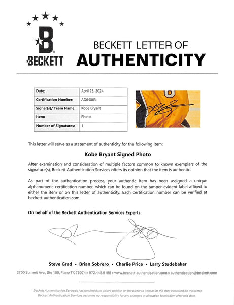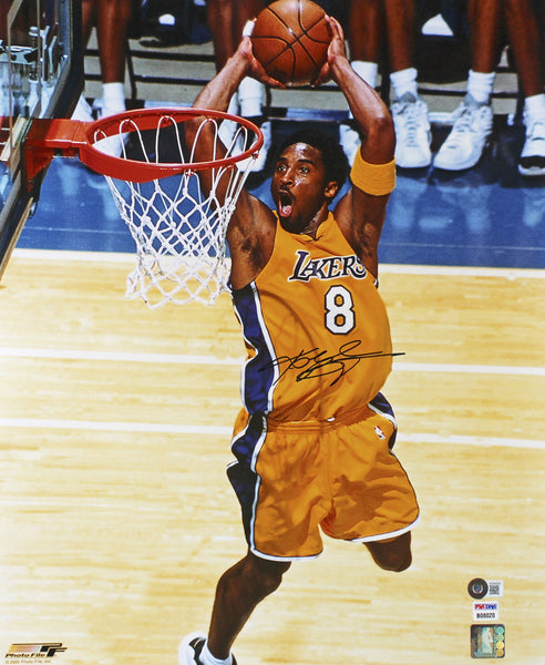 This Autographed Vertical Dunking 16x20 Framed Photo has been Personally Signed by Kobe Bryant of the Los Angeles Lakers. This item is 100% Authentic to include a Certificate of Authenticity (COA) / hologram by Beckett Authentication Services. The authenticity can be verified on Beckett Authentication Services website. This item has been professionally framed to overall dimensions of approximately 31.5 x 36.5 inches.