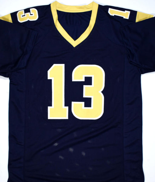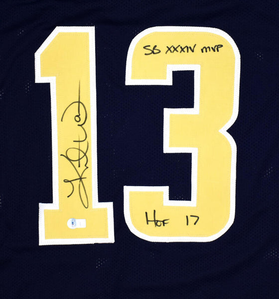 Kurt Warner Autographed Blue Gold Pro Style Jersey w/HOF, SB MVP -Beckett W Hologram *Black THIS IS NOT AN NFL JERSEY. THIS HAS NO TAGS, NO LOGOS, NO EMBLEMS. This is a Kurt Warner of the St. Louis Rams hand autographed custom made (non name brand) authentic style (stitched letters and numbers) jersey. Inscribed SB MVP and HOF. This item has a Beckett Witnessed Authentication, which comes with a numbered hologram and a QR code for verification. You can view this item on the Beckett Authentication website, it shows when and where the item was signed. It was signed either at a public autograph appearance or a private signing. This is a stock photo of the item. Although you may not receive this exact item, the item you receive is virtually identical, brand new, and in great shape. Jersey size is XL.