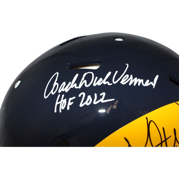 Kurt Warner Marshall Faulk Dick Vermiel LA Rams TB Pro Helmet Beckett 42259 The number in the listing title is just an inventory sku for our records and is not the authentication number. The item pictured is a stock photo unless otherwise noted. This is a Los Angeles Rams Speed Throwback 1981-1999 Authentic Helmet that was personally autographed by Kurt Warner, Marshall Faulk, and Dick Vermiel. Includes a certificate of authenticity from Beckett Authentication Services (BAS) and Denver Autographs.