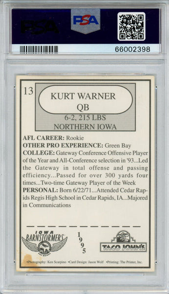 Kurt Warner Signed 1995 Taco John's #13 Trading Card PSA 4 Auto 10 Slab 35836 The number in the listing title is just an inventory sku for our records and is not the authentication number. This is the exact item that you will receive so please see pictures for condition. This is a 1995 Taco John's #13 trading card that was personally autographed by Kurt Warner. This has been professionally graded and slabbed by Professional Authentication Services (PSA) and includes a certificate of authenticity from Denver Autographs.