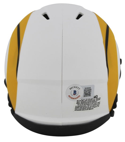 This Autographed Alternate Lunar Speed Mini Helmet has been Personally Signed by Kurt Warner of the Los Angeles Rams. This item is 100% Authentic to include a hologram by Beckett Authentication Services. This item will come with an affixed Beckett Authentication Services (BAS) authentication sticker, which includes a scannable QR code to verify authenticity. Please note that Beckett no longer provides serial-numbered COA cards, and the attached BAS sticker will serve as the complete authentication for this item. The authenticity can be verified on Beckett Authentication Services website.