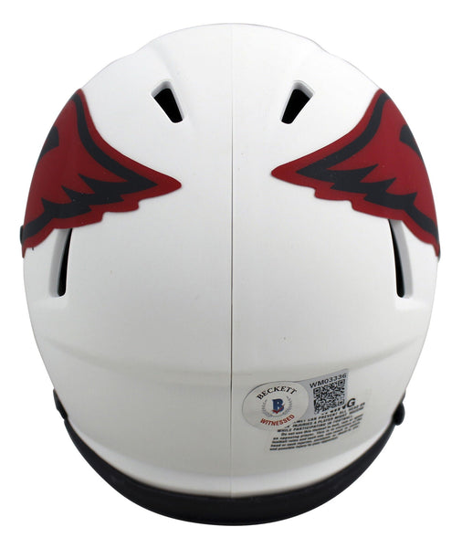 This Autographed Alternate Lunar Speed Mini Helmet has been Personally Signed by Kyler Murray of the Arizona Cardinals. This item is 100% Authentic to include a hologram by Beckett Authentication Services. This item will come with the new Beckett Authentication hologram that has a scannable QR code rather than the traditional COA. If you would like to have a COA, you are welcome to reach out to Beckett for a printed certification once you receive your item.This is a BAS Witnessed Protection Program item which means a Beckett Authentication Service representative was present when this item was being signed. This is a stock item. We conducted an autograph signing with Kyler Murray and we have several of these available. The one you will receive will be of equal quality to the one pictured. This item can be verified through BAS Witnessed.