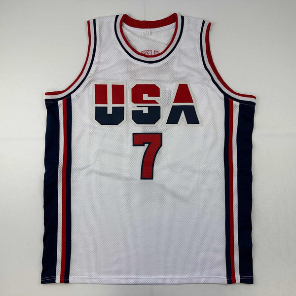 Autographed/Signed Larry Bird United States USA White Dream Team Jersey JSA COA Jersey has no brand names or logos. This is a custom jersey and was not manufactured by or in any manner associated with any professional sports league or manufacturer. This custom jersey carries no professional sports league designation. The item is intended to be an autographed collectible. The custom jersey displays the name and number of the player. This item in no way is affiliated with or connected to any professional sports organization. Size is XL.