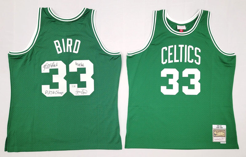 Larry Bird Kevin McHale Robert Parish Signed Celtics Green M&N Jersey Champs BAS