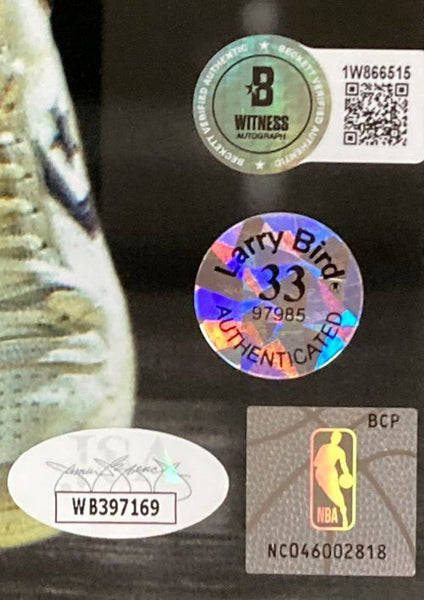 Featured is a Larry Bird and Magic Johnson signed 16x20 photo. This photo has been hand signed by Bird and Johnson and comes with the Beckett and JSA witnessed holograms and certificates of authenticity, along with the Bird exclusive hologram. This photo has been professionally framed and matted and is approximately 22x27. This photo would make a great addition to any sports memorabilia collection!. SPECIFICATIONS Autographed By: Team: Boston Celtics Sport: Basketball Authentication: James Spence Authentication (JSA)