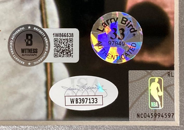 Featured is a Larry Bird and Magic Johnson signed 16x20 photo. This photo has been hand signed by Bird and Johnson and comes with the Beckett and JSA witnessed holograms and certificates of authenticity, along with the Bird exclusive hologram. This photo has been professionally framed and matted and is approximately 22x27. This photo would make a great addition to any sports memorabilia collection!. SPECIFICATIONS Autographed By: Team: Boston Celtics Sport: Basketball Authentication: James Spence Authentication (JSA)