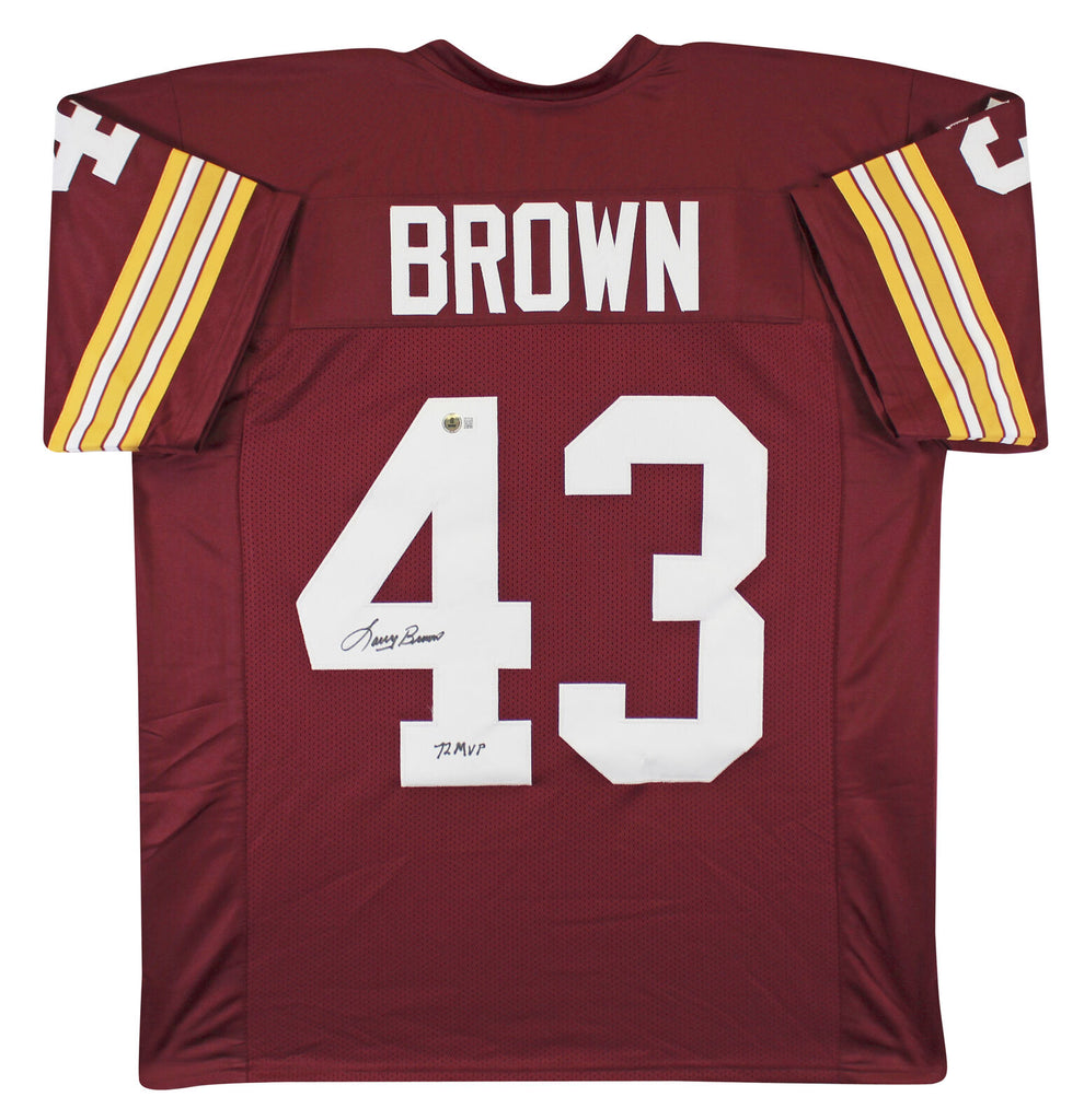 This Autographed Maroon Pro Style Jersey has been Personally Signed by Larry Brown of the Washington Commanders. This item is 100% Authentic to include a hologram by Beckett Authentication Services. This item will come with an affixed Beckett Authentication Services (BAS) authentication sticker, which includes a scannable QR code to verify authenticity. Please note that Beckett no longer provides serial-numbered COA cards, and the attached BAS sticker will serve as the complete authentication for this item. This is a BAS Witnessed Protection Program item which means a Beckett Authentication Service representative was present when this item was being signed. We conducted an autograph signing with Larry Brown where multiples of the same item were signed. While the photographs are representative of this item, the size, placement and strength of the signature may vary. Each item is hand signed, therefore, each autograph is unique. This item can be verified through BAS Witnessed. This is a X-Large sized, non-branded, custom-stitched Jersey.