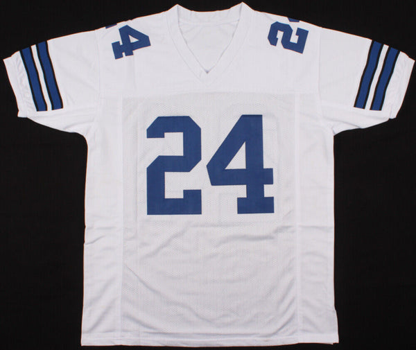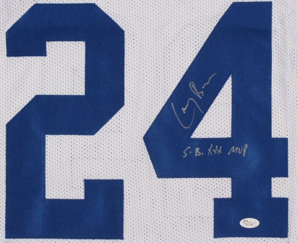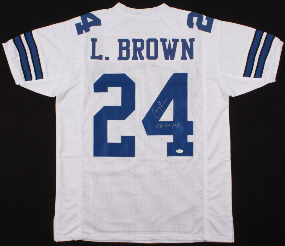 Custom on-field style jersey. Everything sewn on, size XL. Hand-signed and inscribed in silver paint pen by Larry Brown. Please note, jersey shows signs of minor handling.The lot / autograph(s) includes an official James Spence Authentication (JSA) hologram and matching COA for authenticity purposes. The signing of this item was witnessed by JSA.Authentication: JSA COA