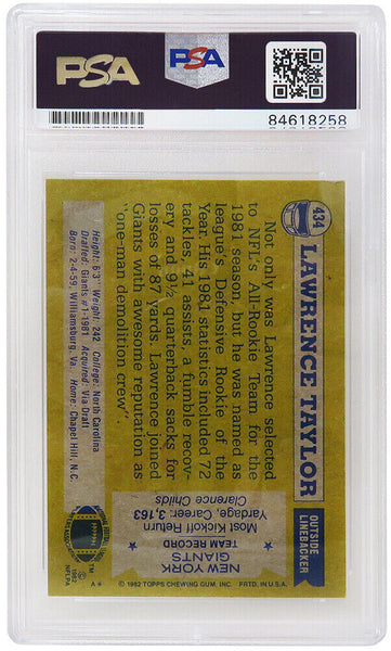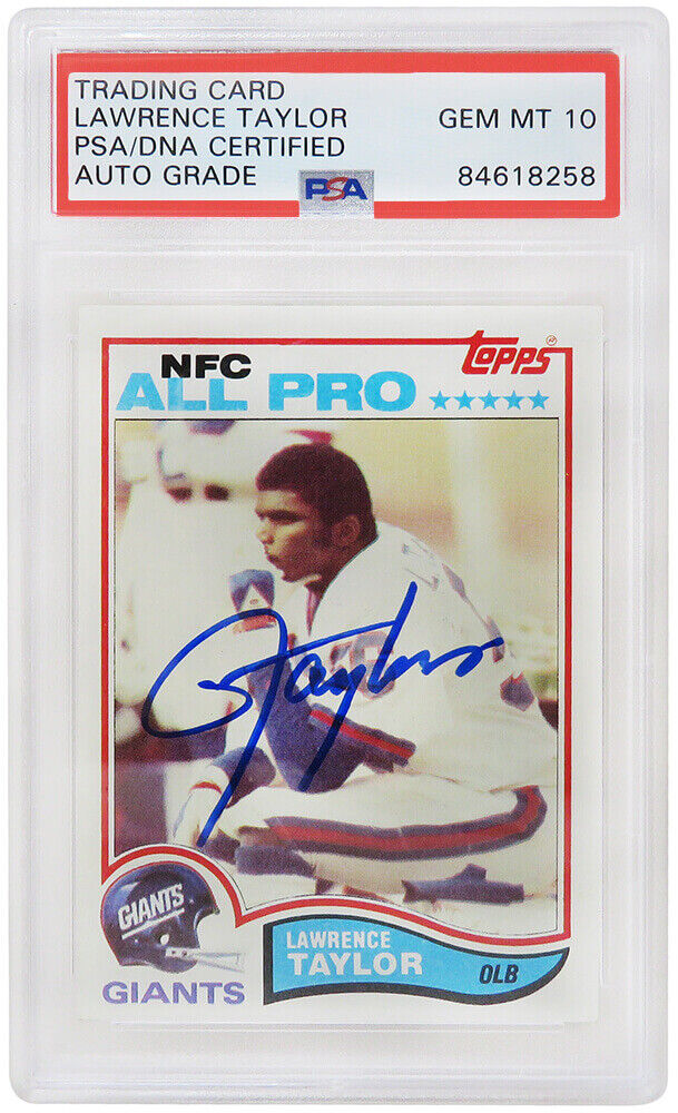 Lawrence Taylor signed New York Giants 1982 Topps football rookie card #434. The card has been authenticated and encapsulated by PSA and the autograph has been given a GEM Mint 10 auto grade. The authentication number can be verified online. Only the autograph has been graded a 10 by PSA, the card itself is ungraded. The image of the item is a stock photo, as we may have multiples of the item in stock. The Slabbed Card you will receive will be of the card described. (Same grade, Same authentication) You may or may not receive the exact PSA serial number on the slab label shown in image.