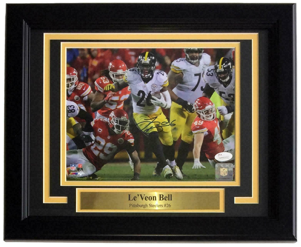 Backed by the JSA 100% Authenticity Guarantee Hand signed by Le'Veon Bell Comes with JSA Authentication Featured is a Le'Veon Bell autographed 8x10 photo. This photo has been professionally framed and matted and is approximately 11x14. This photo has been signed at a private signing and comes with the JSA hologram and certificate of authenticity. On January 8, 2017, Bell started in his first career playoff game and finished with 29 carries for a playoff franchise-record 167 rushing yards and two touchdowns in a 3012 defeat of the Miami Dolphins in the AFC Wild Card game. As the first NFL player to rush over 150 yards in his first two playoff games, he set a record for most rushing yards in the first two playoff games, became one of four players to ever rush for 150+ yards in back to back playoff games, and one of three players with two 160+ yard playoff games in a career.. SPECIFICATIONS Autographed By: Team: Pittsburgh Steelers Sport: Football-NFL Authentication: James Spence Authentication (JSA)