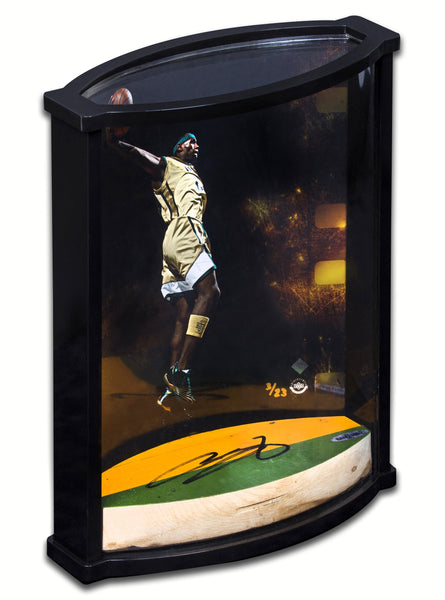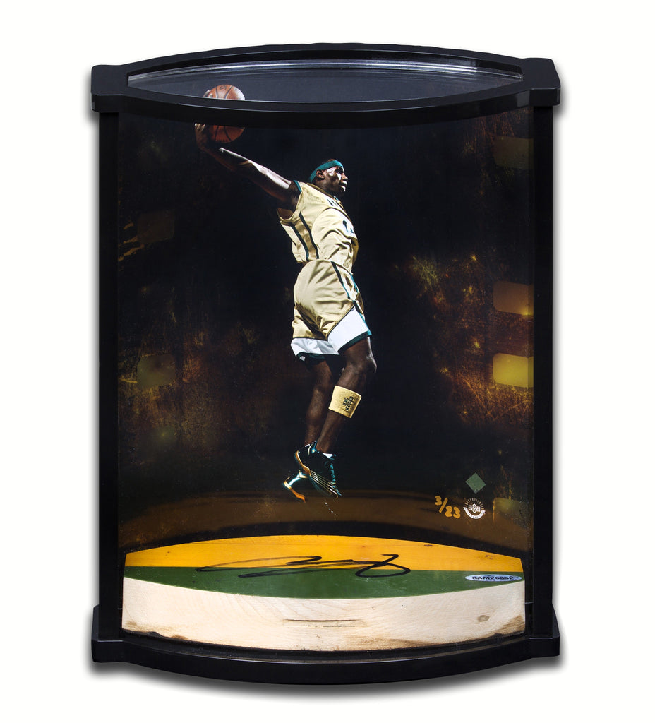 Before LeBron James was a household name across the country, he was a freshman at St. Vincent-St. Mary High School in Akron, Ohio. James led his Irish team to a 23-1 record, en route to the Division III state title. LeBron averaged 21 points and 6.2 rebounds per game his freshman season. During his sophomore season, he increased his numbers across the board to 25.2 points, 7.2 rebounds, and 5.8 assists per game. Again, his team won the Ohio Division III state title with a 26-1 record. He practiced and played many of his early high school games on the schools home court at St. Vincent-St. Mary. By his junior season, his name had become so large and his team so good that the school had to move their games to the local university to accommodate the growing crowds. Recently, LeBron James gave his alma mater a new basketball court, and we acquired the game used floor from St. Vincent- St Mary in which James played. The St. Vincent- St Mary game-used floor piece measures 3" x 7" with LeBron's signature appearing cleanly on the surface. The limited edition (23) "Airborne" photo and floor piece are combined together in a vertical curve display. Upper Deck Authenticated guarantees the authenticity of James' signature on the floor piece through its Five-Step Authentication Process. The authentic piece of game-used floor featured on this item was legally procured directly from the St. Vincent- St Mary. Actual game-used floor section may vary in appearance from product image shown. LeBron fans, score an amazing memorabilia item with this specially-designed curve display piece highlighted by a game-used section of St. Vincent-St. Mary's floor signed by James himself. Presented in a dynamic curve-shaped display, the photo and floor combine for a dramatic visual. The floor rests securely on the display's base and the photo or any of your own 8 x 10's slides easily into the display at a slight curve. Overall, the display has an approximate size of 8.5" wide x 11" high x 3.5" deep. The floor, photo and display pieces are carefully packed inside a protective box for shipment.